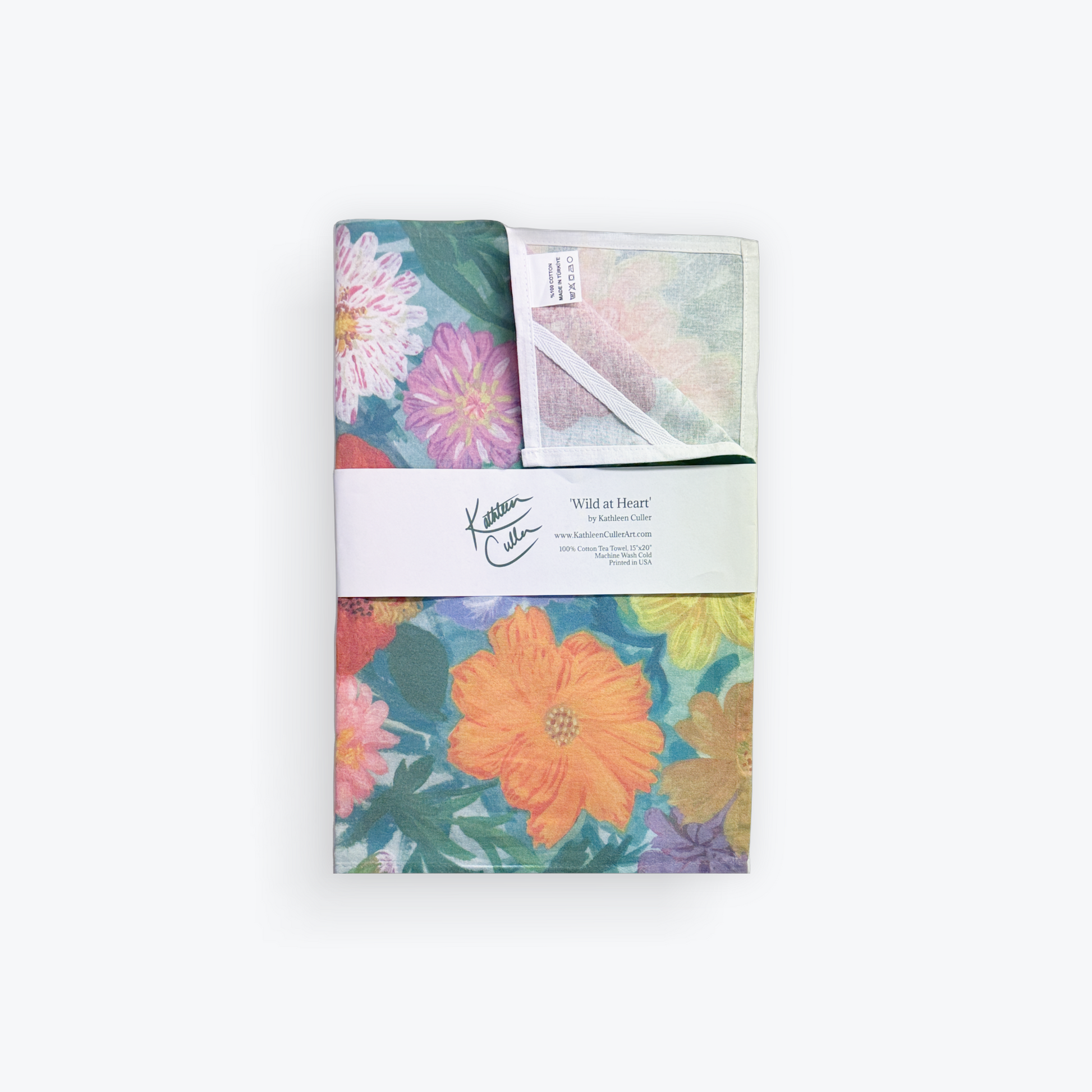 Cotton tea towel featuring full bleed print of 'Wild at Heart', © Kathleen Culler, 2025.